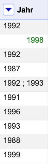 Die Spalte Jahr enthält noch Einträge mit Bindestrich, z.B. 1993-1995. Adaptieren Sie den vorherigen Code, um auch die Bindestriche durch ein Semikolon und Leerzeichen ; zu ersetzen. Nutzen Sie dabei ein Text Facet und einen Text Filter, um sich sich die relevanten Einträge anzeigen zu lassen.