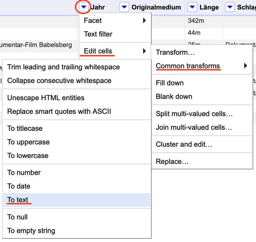 Öffnen Sie das Dropdown-Menü einer Spalte, den Reiter Edit cells und Transform…, um das das Menü zur Transformation von Zellen mittels GREL anzuzeigen.