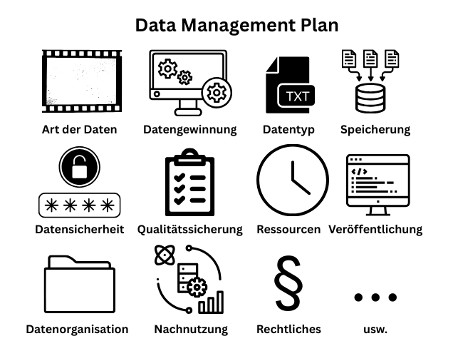 Um einerseits die Organisation des FDMs zu bewerkstelligen und andererseits klare, nachvollziehbare Strukturen zu etablieren, empfiehlt es sich, einen sogenannten Datenmanagementplan (kurz: DMP) zu erstellen. In einem DMP können die bisher weitestgehend grob bzw. abstrakt zusammengefassten Phasen des Datenlebenszyklus systematisch dokumentiert und organisiert werden. Der DMP muss hierbei als ein “living document”, also ein lebendiges Dokument, verstanden werden, denn sowohl die eigentliche Forschung selbst als auch das FDM sind komplex und (besonders bei Langzeitprojekten) hochdynamisch; selten verlaufen diese Prozesse linear. Im Wesentlichen sind DMPs von Menschen lesbare Dokumente, wobei es mittlerweile auch eine Reihe von Entwicklungen hin zu automatisierten und maschinenlesbaren Formaten gibt.