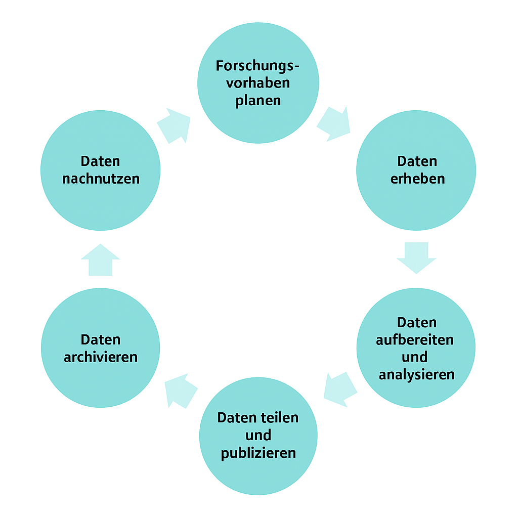 Dieser Prozess – also das Durchlaufen der einzelnen Schritte und Phasen der Forschungsdaten während der Projektumsetzung – wird oft auch als Forschungsdatenlebenszyklus bezeichnet.