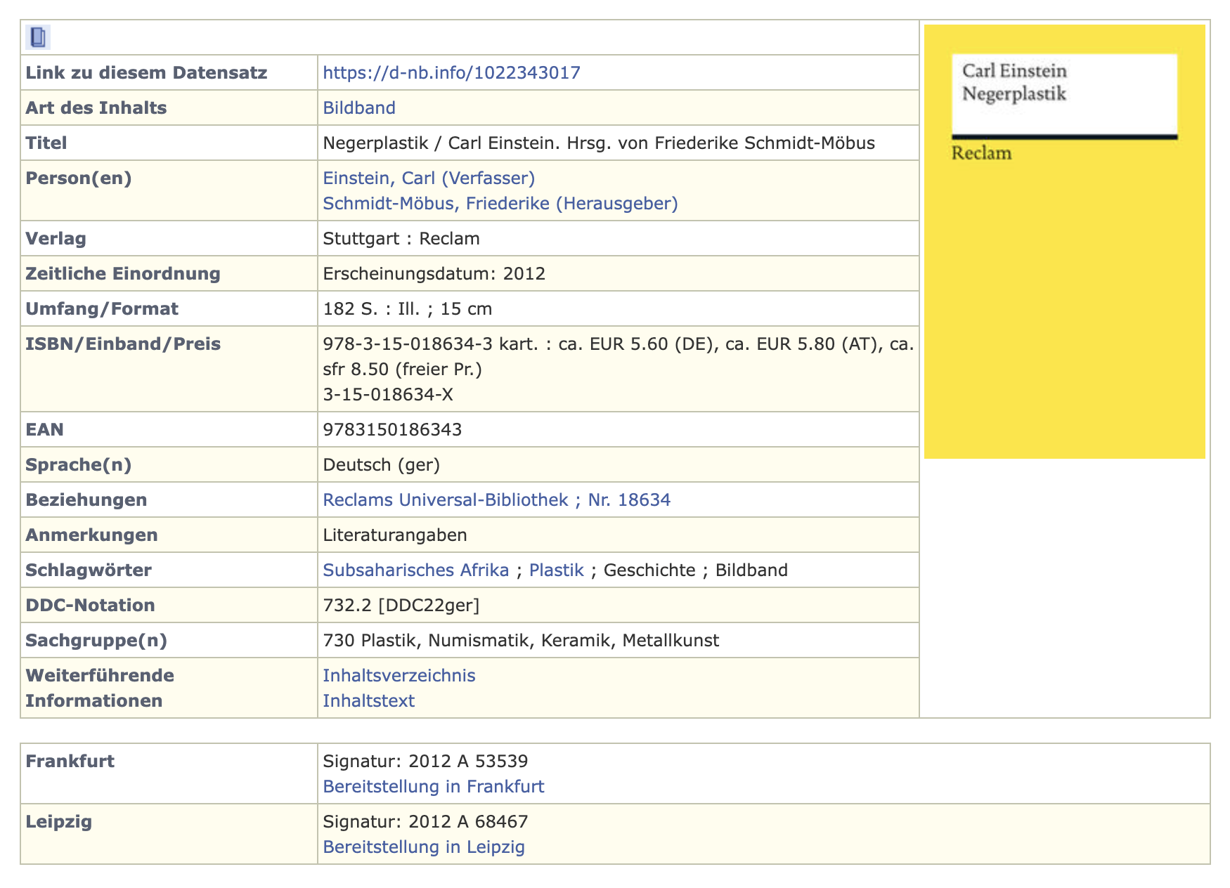 Dogtas et al. verweisen in ihrem Aufsatz auf den Buchtitel “N*plastik”[1] von Carl Einstein , vorzufinden in diversen Datenbanken wie beispielsweise auch im Katalog der Deutschen Nationalbibliothek (kurz: DNB). Im vorliegenden Datensatz der DNB wird der Titel ohne Verweis auf seine zeitgenössische Problematik kommentarlos in den Metadaten reproduziert.