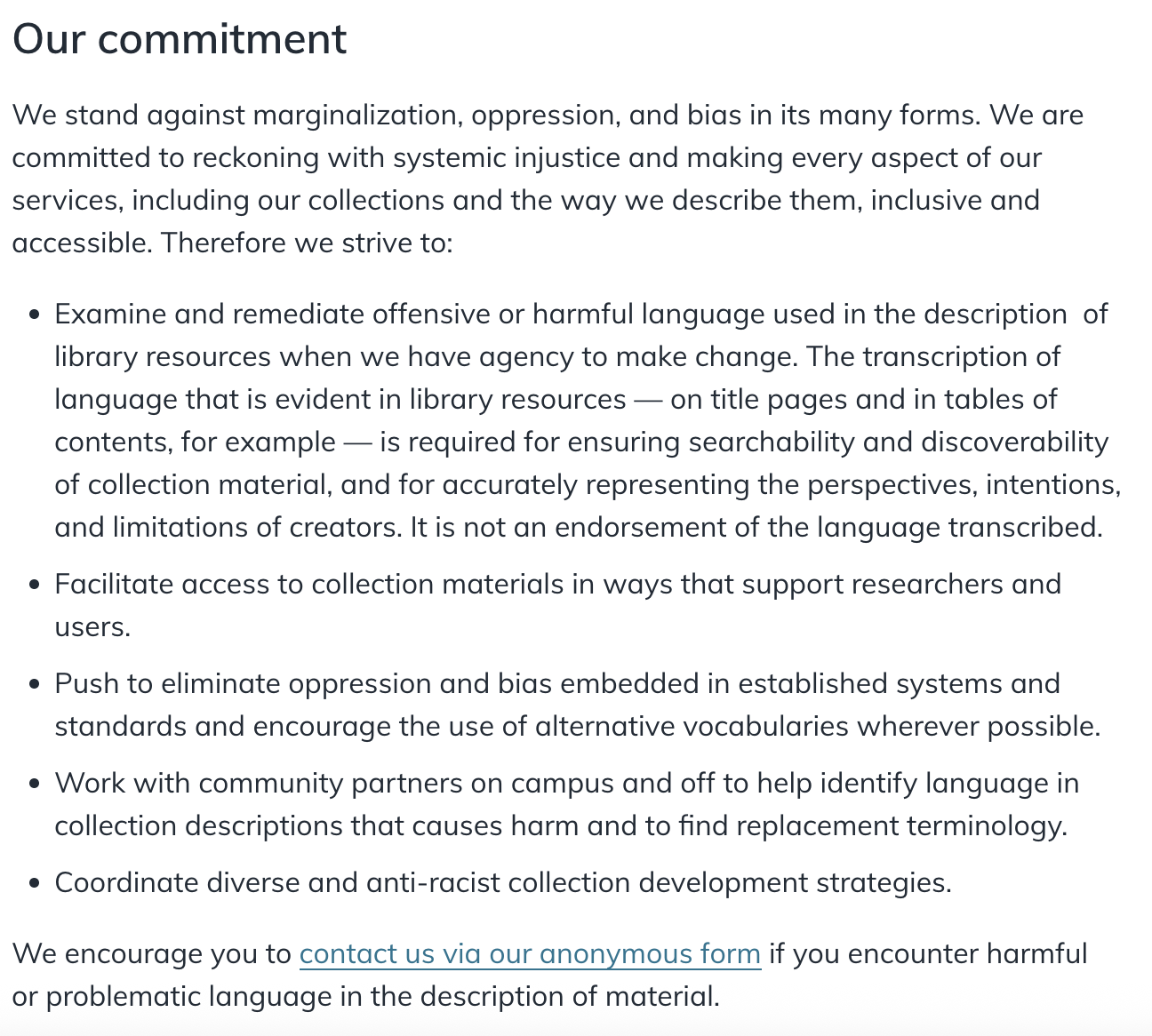 Zum anderen möchten wir noch auf das Statement der University of Michigan Library verweisen. Einerseits wird festgehalten, dass beschreibende Metadaten grundsätzlich nicht neutral sind, andererseits reagiert die Bibliothek direkt auf diesen Umstand und benennt Maßnahmen zur Identifizierung, Kontextualisierung und deren Überarbeitung.
