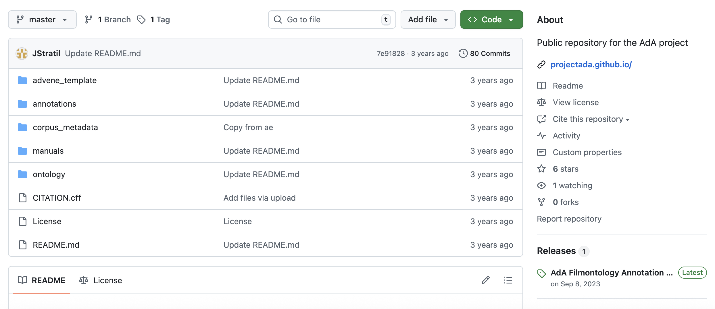 Das Forschungsprojekt ”Affektrhetoriken des Audiovisuellen” (kurz: AdA) stellt seine filmanalytischen Annotationsdaten als ein öffentlich zugängliches Datenpaket zur Nachnutzung in einem Github-Repositorum zur Verfügung. Die Projektergebnisse und Forschungsartefakte umfassen: eine Filmontologie und das Vokabular (AdA-Filmontology), ein projektspezifisches Template für die Annotation mit dem Tool Advene sowie die Annotationsdatensätze selbst.