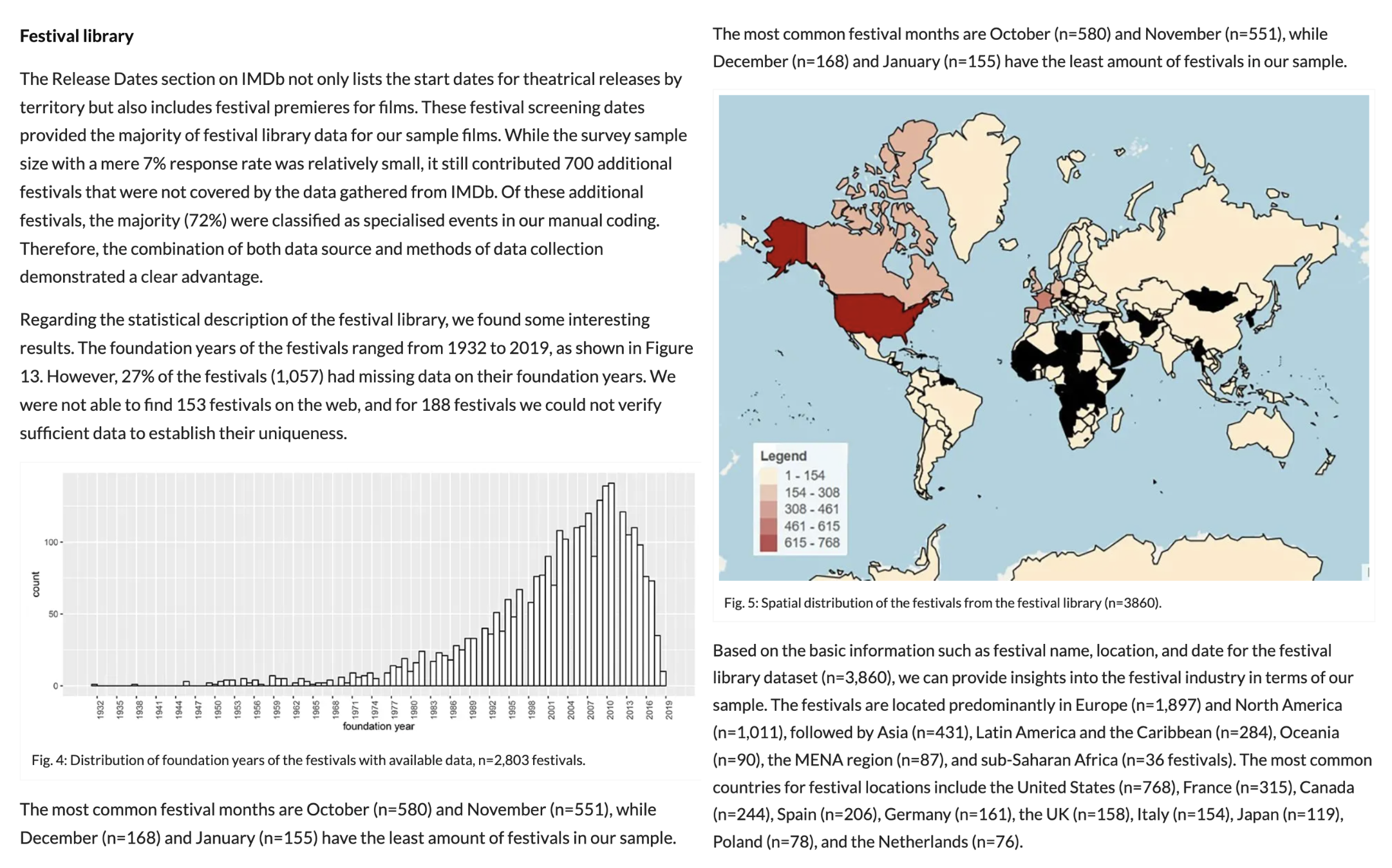 Ein Beispiel für ein Data Paper aus der Fimwissenschaft ist der Aufsatz ”How to capture the festival network: Reflections on the Film Circulation datasets” publiziert auf NECSUS von Skadi Loist und Evgenia (Zhenya) Samoilova. Darin dokumentieren die Autor:innen Kontext, Struktur, Aufbereitung und Auswertung ihres Film Circulation Project Datensatzes mit entsprechenden Berechnungen, Logiken und Visualisierungen. Als Necsus-Datapaper wird der Datensatz somit zugleich als eigenständiges Forschungsergebnis sichtbar.