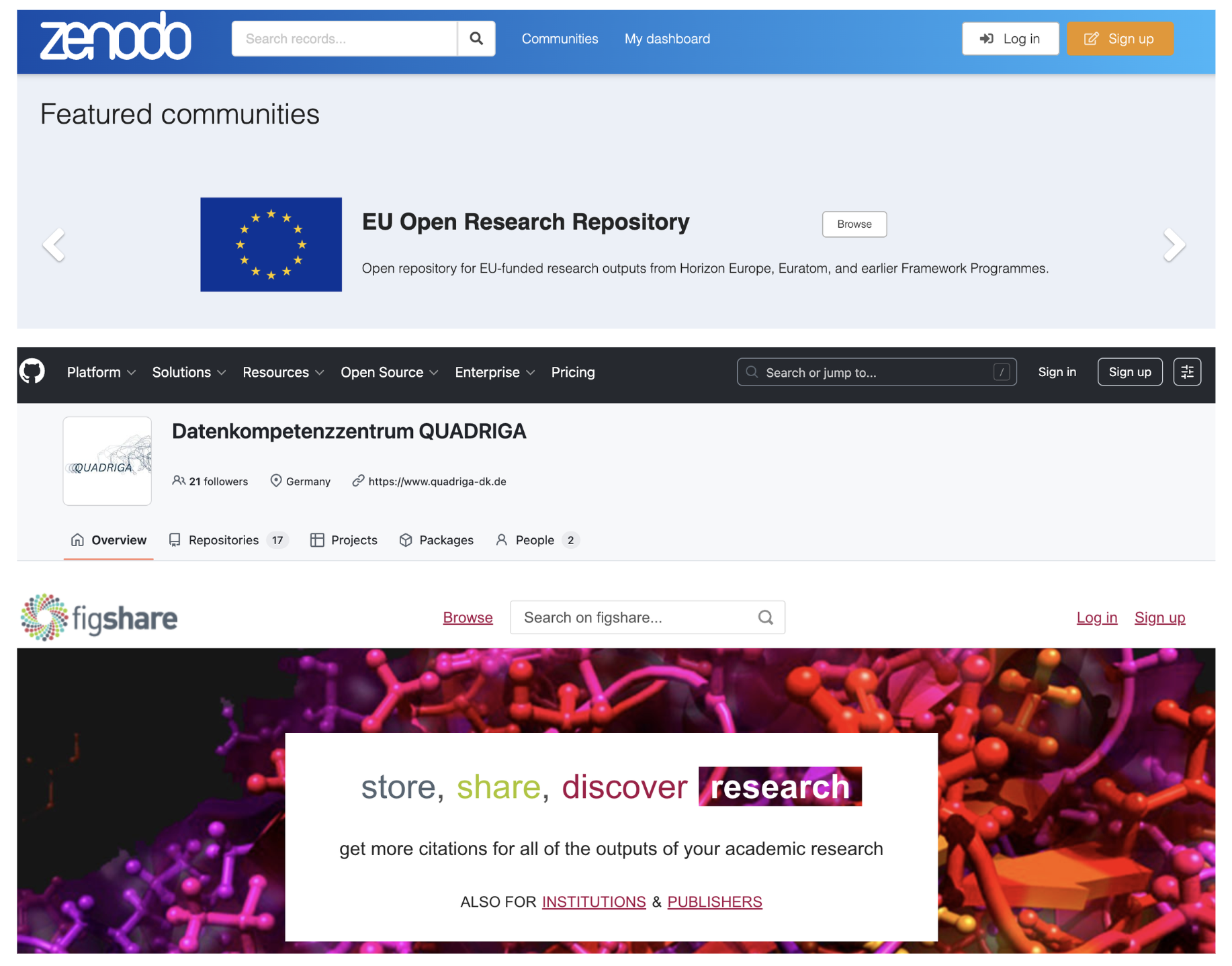 Fig. 4.4 Startseite der etablierten generischen Repositorien Zenodo, Github und Figshare#