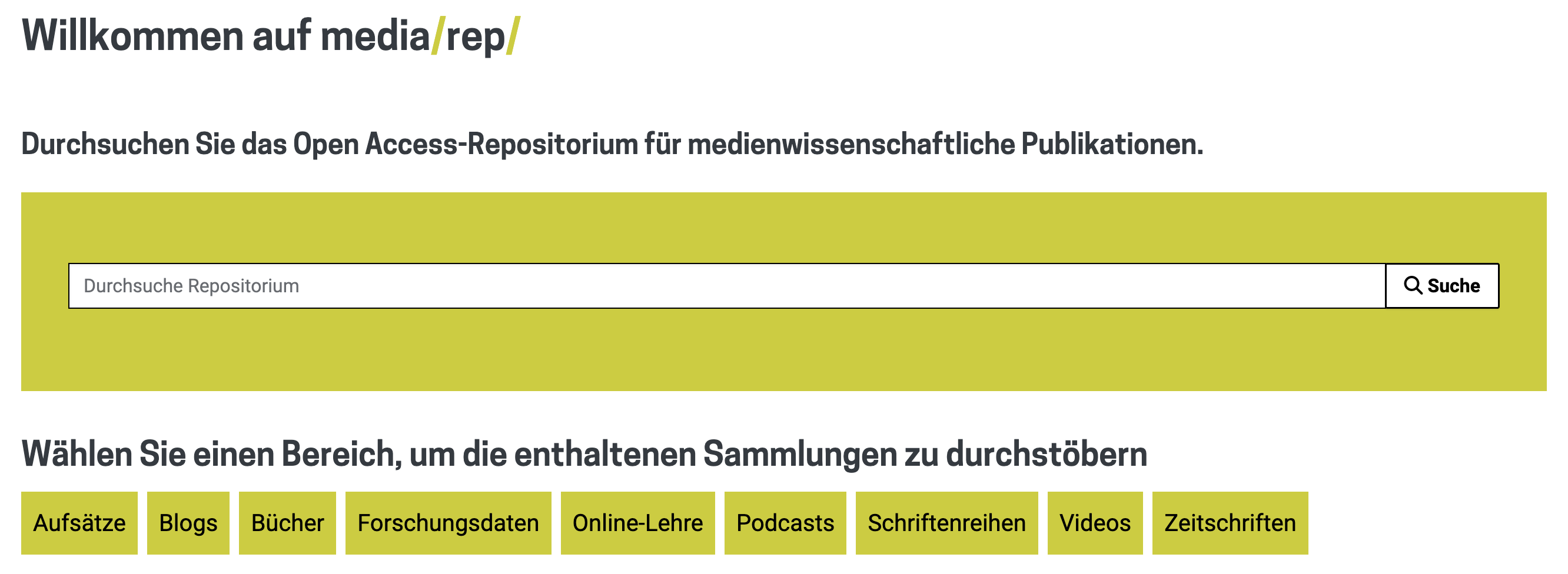 Disziplinäre Repositorien hingegen sind institutsübergreifend und Forschungsorte der Exploration der jeweiligen Fachdisziplin. Einer der wichtigsten Repositorien der Film- und Medienwissenschaft ist media/rep/. In dem Open-Access-Fachrepositorium werden Publikationen, Aufsätze, Forschungsdaten und andere Ressourcen der Film- und Medienwissenschaft kostenfrei und ohne Zugangsbeschränkung verfügbar gemacht. Es dient als zentrales und dauerhaftes Archiv der Disziplin und fördert Wissenschaft, Austausch und Forschung.
