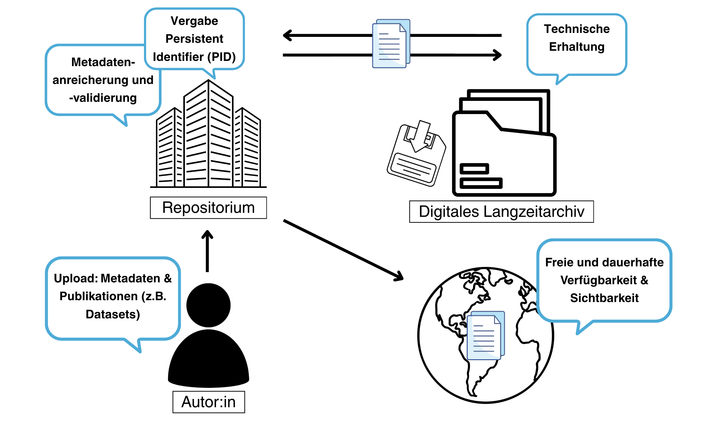 Sehr beliebt und niedrigschwellig in den erforderlichen Kompetenzen sind wissenschaftliche Repositorien. Repositorien sind digitale Speicherorte und Datenlager, in denen Forschungsdaten veröffentlicht, verwaltet und aufbewahrt werden können. Die in einem Repositorium publizierten Daten können Nutzer:innen, zumeist öffentlich und teils beschränkt, zugänglich gemacht werden.