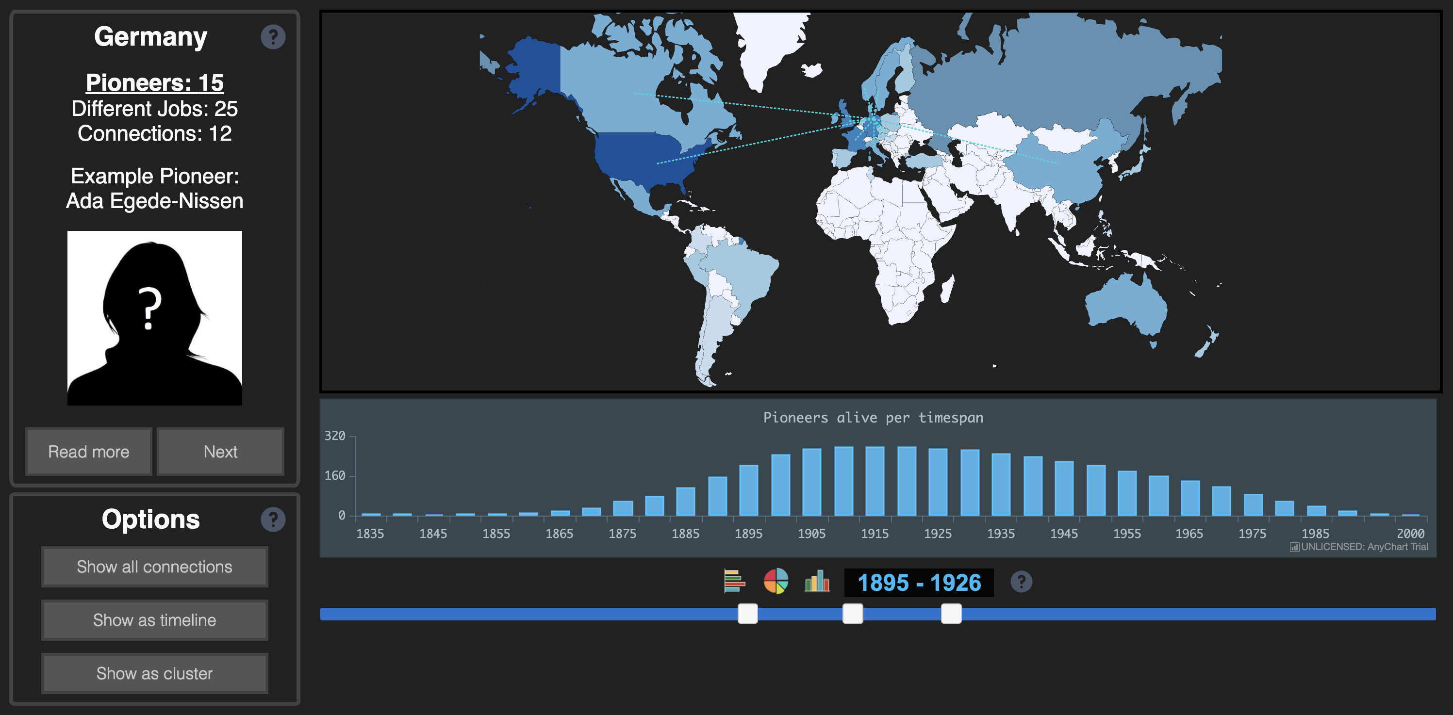 Neben klassischen GLAM-Portalen gibt es auch Forschungsprojekte mit umfangreichen Datenmengen, die zur Exploration und Nutzung ihrer Daten eigens dafür entwickelte interaktive Webseiten konzipiert und umgesetzt haben. So beispielsweise der Women Film Pioneers Explorer unter der Leitung von Dr. Sarah-Mai Dang und Prof. Dr. Thorsten Thormählen. Der Explorer ermöglicht anhand interaktiver Visualisierungen die Erkundung biografischer Datenmengen von Frauen der frühen Filmgeschichte (1890-1920).