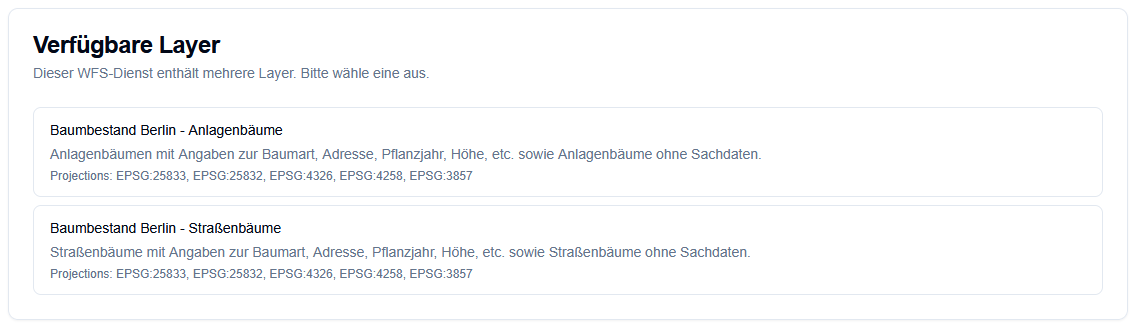 Fig. 3.1 Screenshot des WFSExplorers der Open Data Informationsstelle mit Anzeige der verfügbaren Layer vom 24.03.2026.#