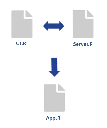 Shiny Eine Anwendung besteht aus einer serverseitigen Logik und einer Benutzeroberfläche (UI). Beide Komponenten werden häufig in einer gemeinsamen Datei (app.R) implementiert. Eine Trennung ist jedoch möglich, indem Server- und UI-Teil in die Dateien server.R beziehungsweise ui.R ausgelagert und anschließend über app.R integriert werden. [@walker_tools_2016]