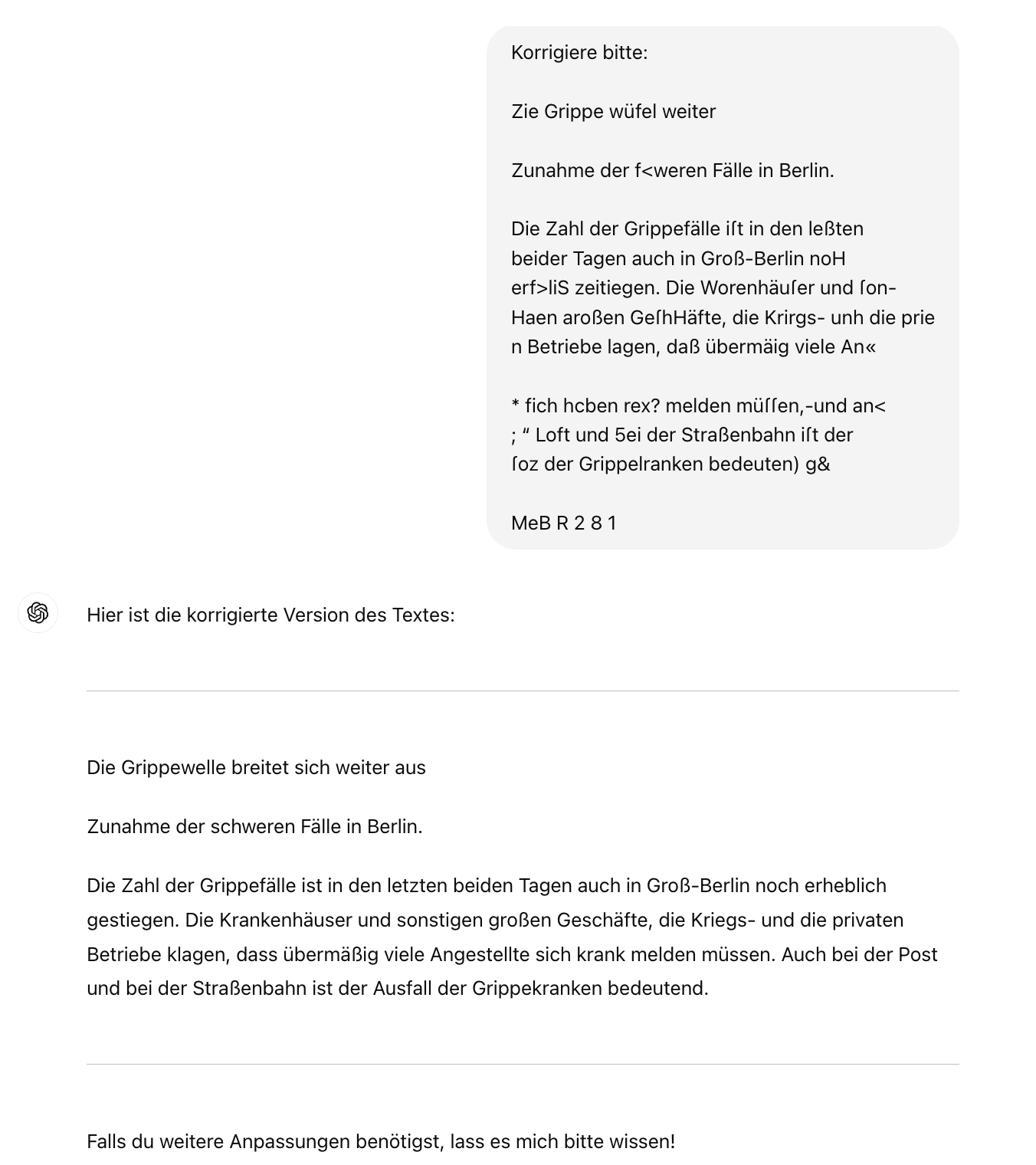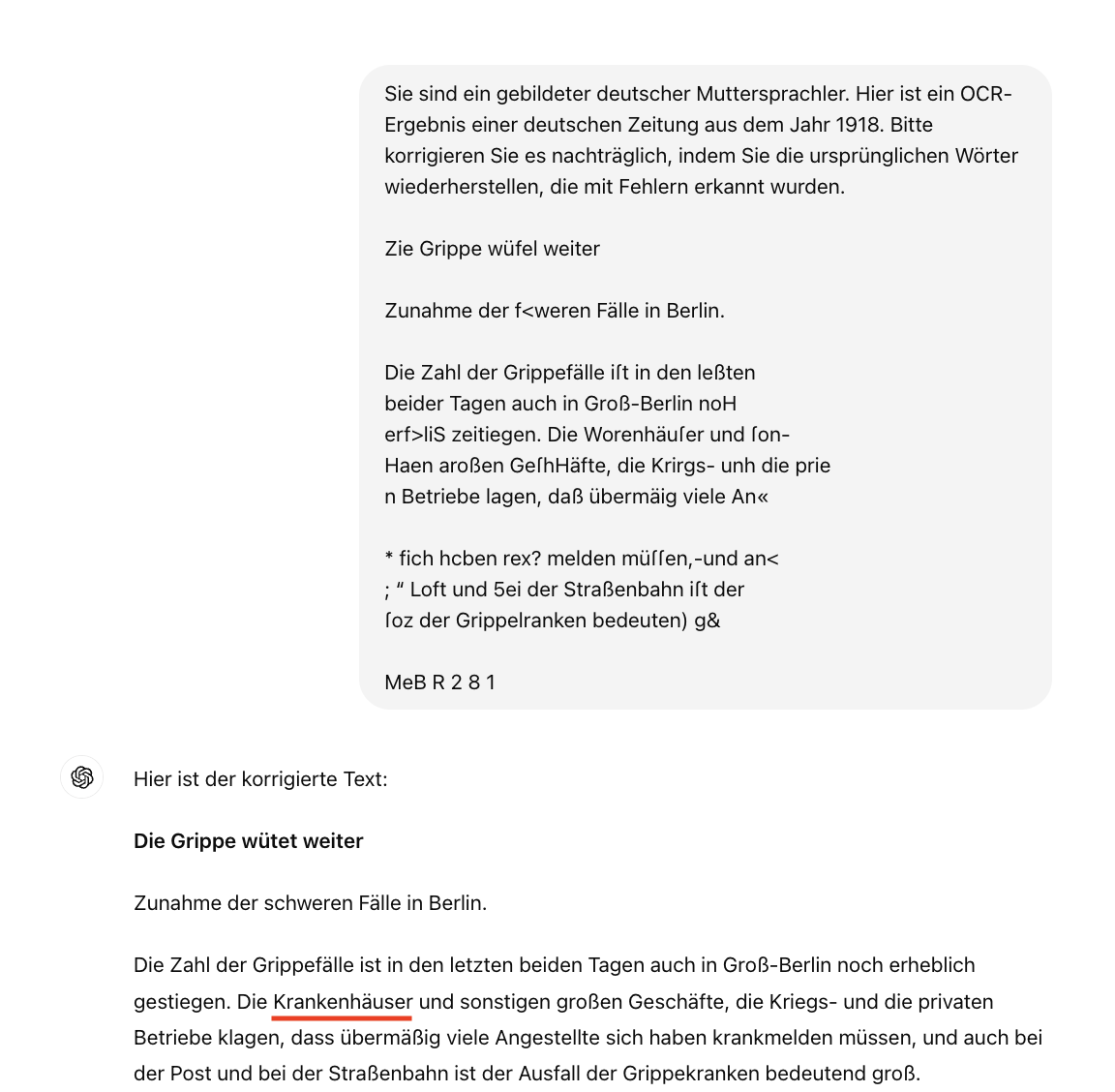 Natürlich gibt es auch intelligentere Methoden zur Nachbearbeitung von OCR-Ergebnissen. Diese Methoden basieren auf datengesteuerten maschinellen Lerntechniken. Zum Beispiel können große Sprachmodelle manchmal sehr gut bei der Nachkorrektur von OCR-Ergebnissen abschneiden. Es ist jedoch wichtig, sich ihrer Risiken und Einschränkungen bewusst zu sein.